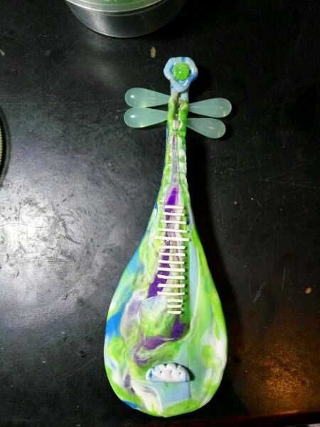 还在等彻底硬化之后上光油和拉弦……哎妈呀,弄了一下午,底下小了,也懒得再改了……自己家娃能用就好……本来想做一个琉璃琵琶,但是买回来的件不是大了就是小了……除了那四个水滴,其他的都没用上