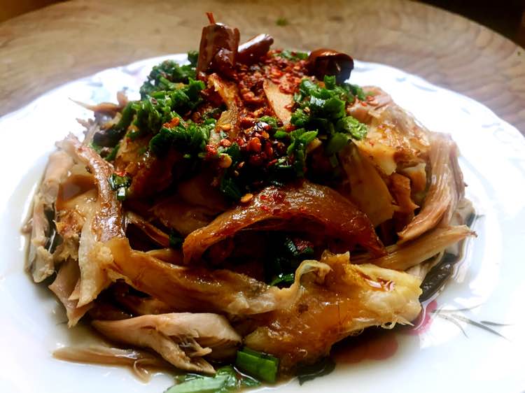 手工撕鸡皮鸡丝,之后就是调料了,这个看个人喜好的味道调汁,最重要的是要干锅背花椒粒和干辣椒再和少许菜籽油小火慢慢炸出香味,浇在鸡丝上面的辣椒面上,趁着油热立刻倒入红醋喷香,香油,鱼豉油糖盐等自己调味