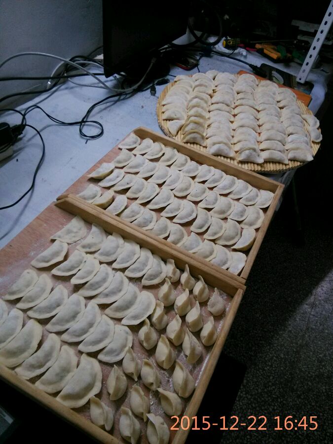 从十一点就开始弄了,老公不会包没办法帮忙。我弄完馅再和面,然后自己压皮自己包。。