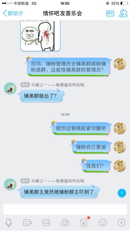 锤黑群来了几个锤粉,结果一个锤粉群的管理跑来威胁锤粉们,必须退了锤黑群。这尼玛能说明我们怕了锤粉群的管理员,我他妈真日了狗了。