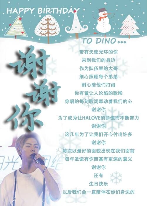 「他,是韩国新人男子组合halo的大哥,是队里的温暖存在,是迷人声线的拥有者。每一年的12月25日,是耶稣的诞生日,同样,也是他的诞生日。赵圣镐,DINO,祝你生日快乐」
