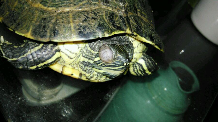 现在就只滴的眼药水,还有就是干养了,先不把它放水里了。我看着轻一点了,它那只眼能睁开一半了,肿的也轻点了
