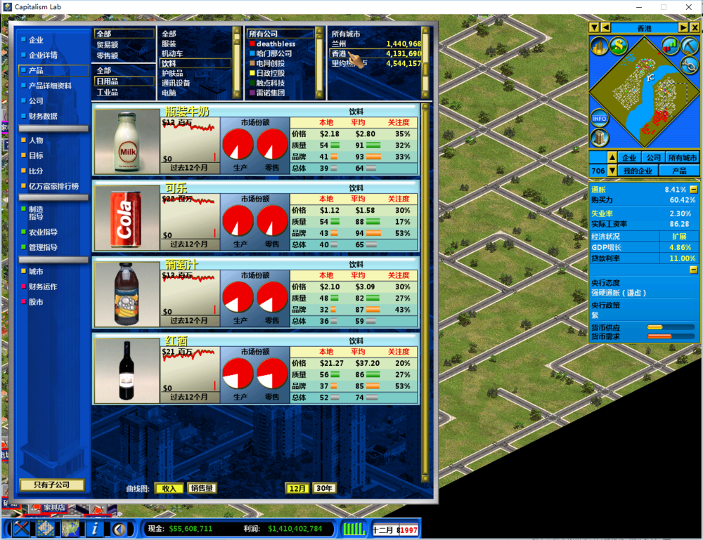 至于垄断一个产品成为首富,显然是不现实的,游戏的人口是基本固定的,市场的需求摆在那里,你想做高端市场,人家产品有评分啊!和质量品牌价格有关,你把一个猪肉调到1000元 一份都卖不出去,评价都是负的,你是把一个圆盘想像成若干个群体构成,有穷人有富人所以可以高端低端一块搞,但是实际上一个城市的购买力是完全固定的,人家控制这个高低端是通过 关注度 这个来控制的,比如一个产品的价格关注度是50%,质量是50%(基本就肉类这样,还得是穷的地方)那么你品牌就毫无意义,这就是为什么好多人的开局选择三农的原因。你可以横向对比一下,一般穷的城市都是很关注价格,富的城市更多关注品牌的,所以只从利润角度讲,我就抓住一个大富城垄断(如东京这种,400w人口80+工资),比我垄断3个小穷城利润高太多