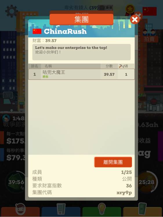 有玩的小伙伴嘛?终于攒好钻石建立集团啦,来加入我的集团吧!一起点点点哈哈哈!集团代码xry9p 名字叫ChinaRush