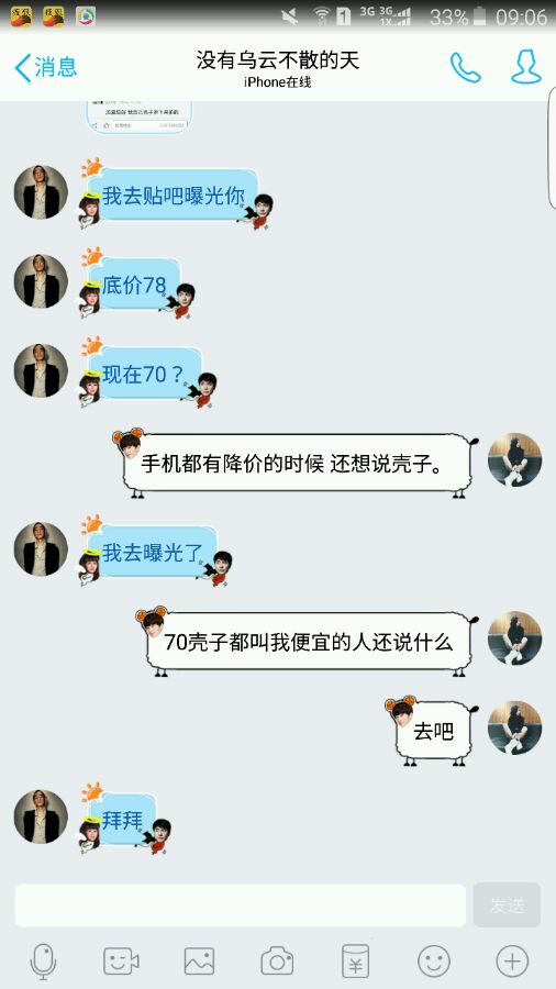 因为之前的时候手机壳还没有降价 我在这个贴吧发了一个贴 低价78 卖80 然后我现在有生意了 厂家多给我便宜了 然后我卖了70 他说要来贴吧爆我 神经病