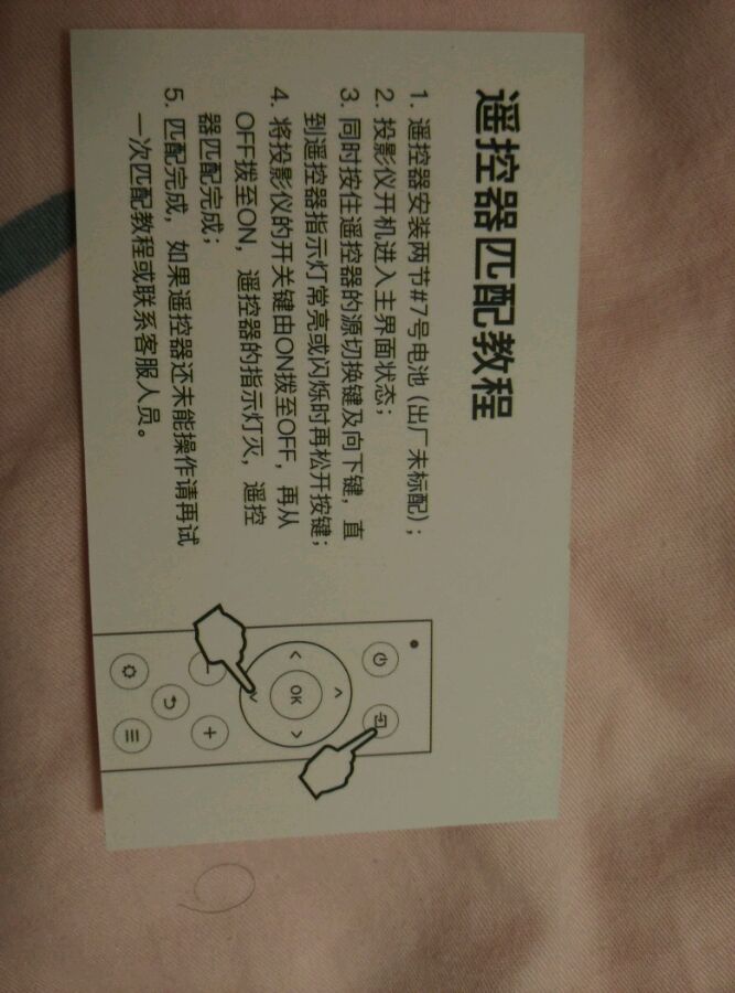 如题,今天刚到的货,遥控器装了电池,但不管怎么对着投影仪按都没反应。从评论上看有人说要匹配,可说明书上没写匹配这一项啊。请问有谁知道如何匹配吗???