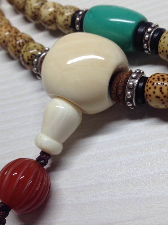 砗磲打孔都是小孔,孔大了容易裂。砗磲白料很便宜,好的玉化料估计很少拿来做佛头,都去做珠子吊坠一类的了。而且玉化的砗磲容易雾化,要注意保养的,一周要上一次橄榄油。还是用象牙果菩提根做佛头好一点。