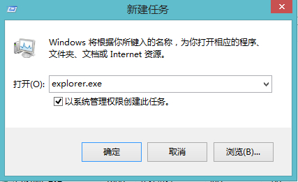 再点”文件“——“运行新任务“,输入explorer.exe,勾选”系统管理权限“