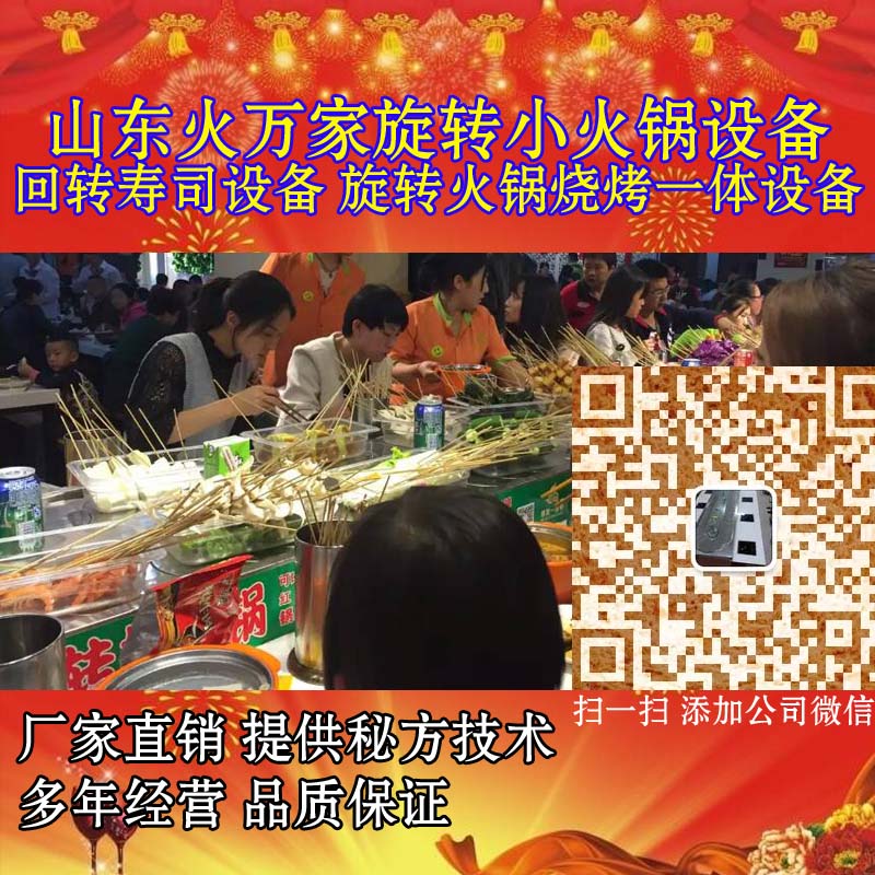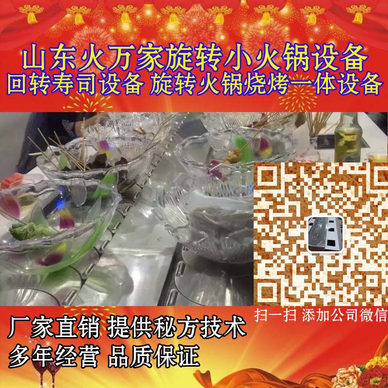 山东火万家回转火锅设备麻辣烫回转火锅利用现代化的餐饮设备开创新型餐饮模式。麻辣烫回转火锅采用全自动回转火锅传送食材,其特点是时尚、卫生、快捷、营养全面,不必长时间等餐,根据不同人群的需求即可以是快餐也可以是慢慢享受的美食。无需大厨,管理便捷,自动化回转火锅传送食材,即保证菜品新鲜卫生又免去人力传菜环节,可有效节约人力成本,提高顾客满意度,增加经营利润。即日起。凡在我司订购设备的客户,首次可随设备免费赠送以下任意三种口味底料。先品尝下,口味确实