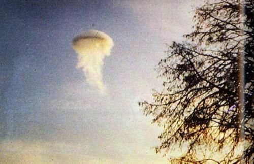 1957年10月16日,在新墨西哥州三河城附近的美司卡雷洛印度保留区做护士的埃拉·刘易斯·福顿,在驾车沿霍洛曼空军基地附近的54大道行驶的过程中,拍摄到这张照片。