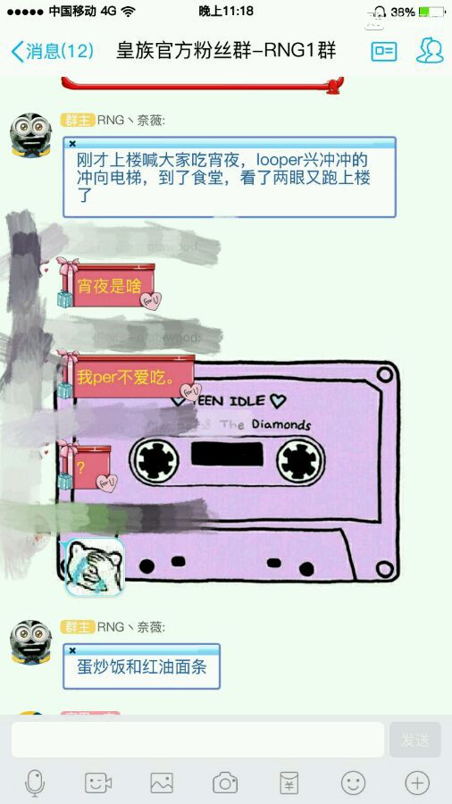 大概是前天的截图,群主夜宵时间到per一开始听到有夜宵还很开心的去食堂一看到不是自己喜欢的东西就摇了摇头→_→(这个挑食的少年)群主说looper摇头炒鸡萌啊\(//∇//)\