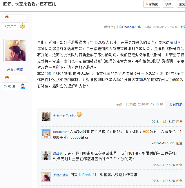 另外这只是这一个区的这一个号,每个区其实都有1-5个专门出现在抢限时和大转盘的“测试号”,经常出来活跃放着一大堆BUG不处理不知道在测试啥的“测试号”,你留心也没用,他会改名,会官方删除数据,官方一律找不到号,除非玩家有截图赖不过去。