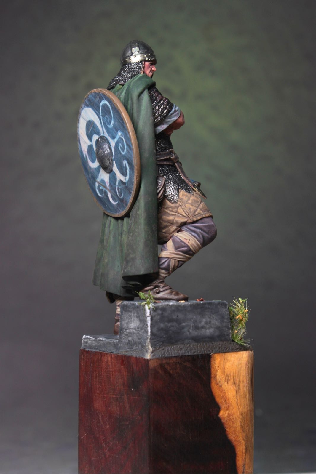 毕加索90mm维京头领,以前在易趣上收的,头盔羽毛没装。原作地台是40mm见方的,手头有444的大红酸枝带白皮料,就直接上了,花草是mininatur的。大家多多指正。