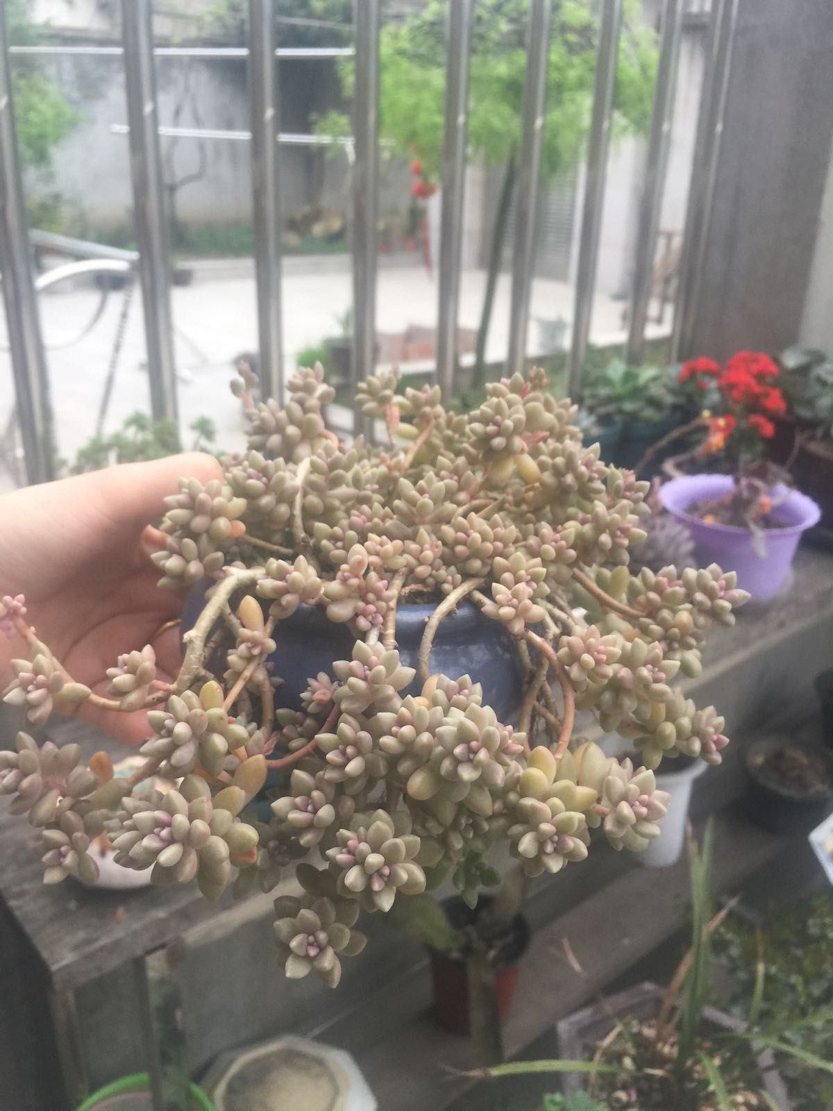 别换盆,我的换了盆之后叶子和枝头掉了很多,臭的不行。就随便它这么长,这样看起来还不错,要是杆子长长了,把盆子垫高一点,自然垂下来呗。