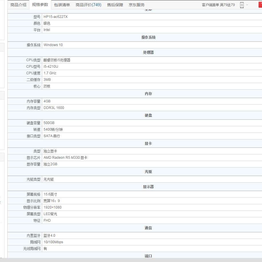 惠普(HP)HP15-ac622TX 15.6英寸笔记本电脑(i5-4210U 4G 500G M330 2G独显 FHD Win10)银色