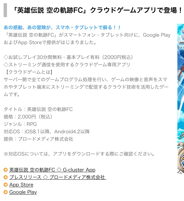 Android / iOS 《英雄伝説 空の軌跡 FC》 / G-cluster App 「英雄傳說 空之軌跡FC」於雲端遊戲APP登場!