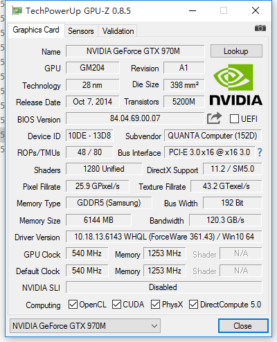 独立显卡 NVIDIA GeForce GTX 970M(6G)