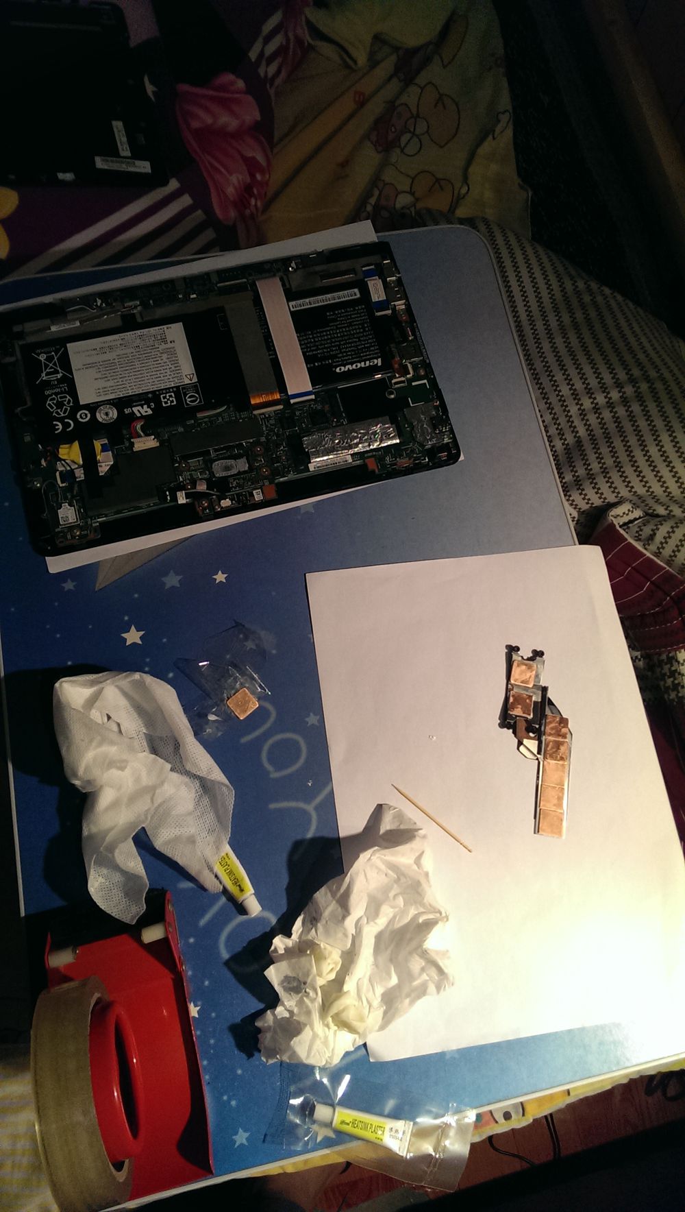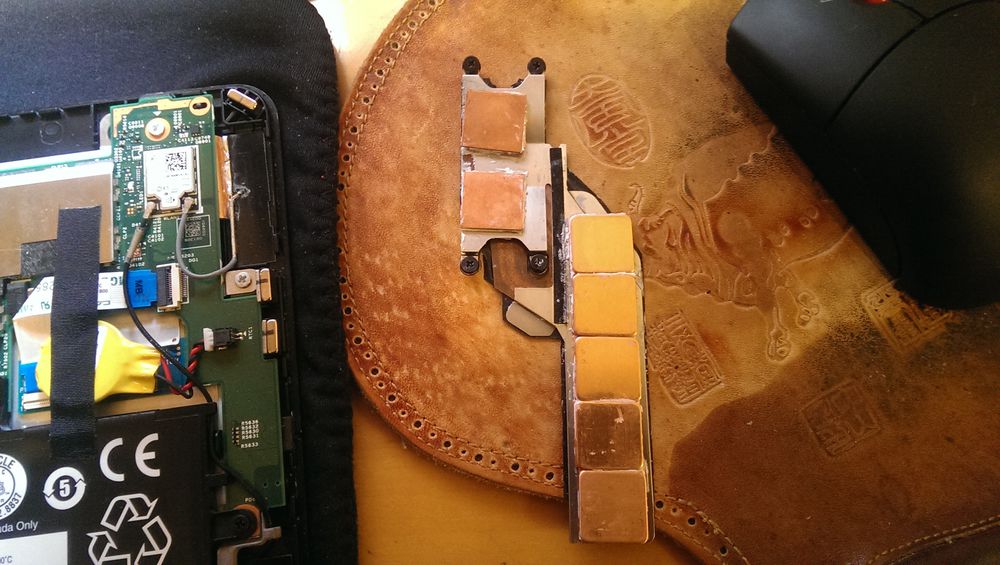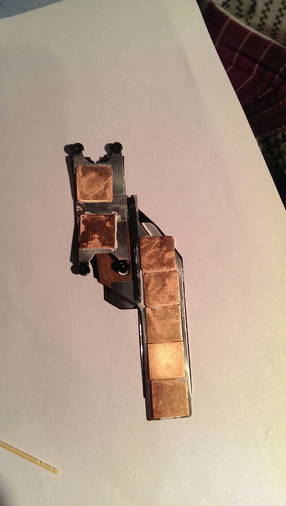 最后是这周的改造,在上周原有的基础上又加了7片铜片,cpu上面的2个铜片是0.3毫米厚,15X15毫米铜片,温度比上周又下降了10°左右;现在拷机玩游戏看网页最高温度不过55°,都在55°以下浮动效果还是很好的,值得注意的是加铜片增加散热性能要注意厚度,我这次改的这个散热,最终用的铜片量为:10个1毫米厚15x15毫米的铜片通过导热胶黏在散热器比较长的地方如图;然后散热器cpu附近用的是2个1毫米厚15X15毫米的铜片+0.3毫米厚15X15毫米铜片,这周和上周加的铜片是以上下叠加方式进行,我看过了厚度最多就这样了不能再加了,再加A壳盖子盖上就会压坏机器的;所以要改造散热的朋友注意下!