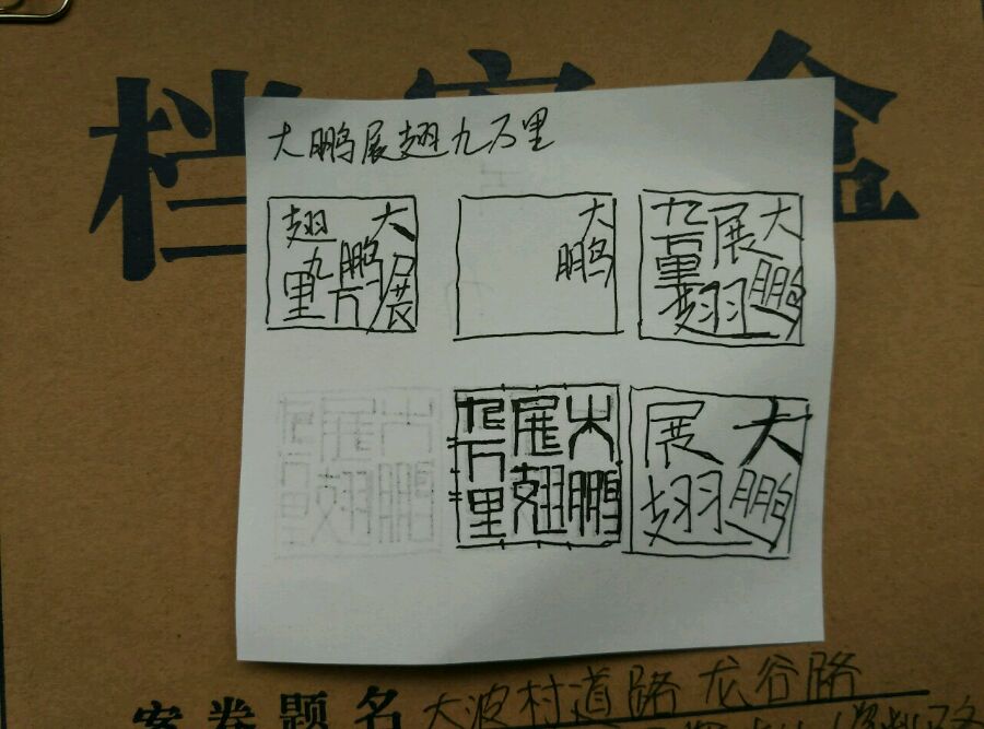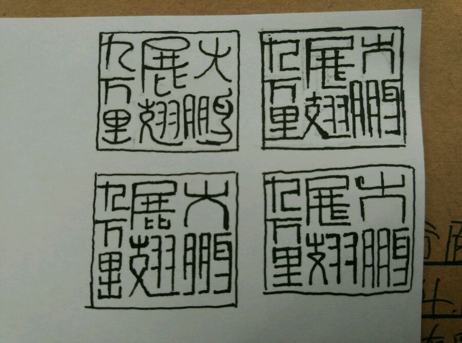 就着群里面群主出题"大鹏展翅九万里",让大家设计简体印。我就把自己这些看法发出来,大家讨论。顺便把我的简篆设计图发上来,大家研究。刀法还没练好,印就不刻了,以免又被别人拿来奚落辱骂。