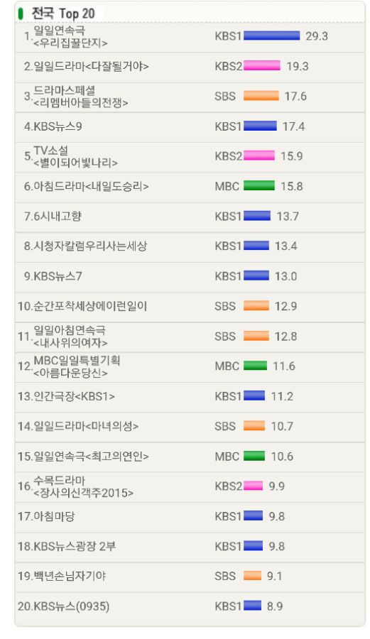 具体数据来看,昨日《Remember》第14集的全国收视率共计15.6%,较前一集上升了0.5个百分点,仍以绝对优势位居水木剧冠军宝座。紧随其后的是KBS 2TV水木剧《生意之神-客主2015》,收视率较前一集增长了1.6个百分点,共计11.8%。而MBC水木剧《再一次Happy Ending》的收视率虽较前一集上涨了0.4个百分点,但仍以6.7%的全国收视率垫底。