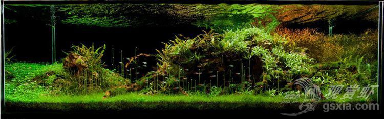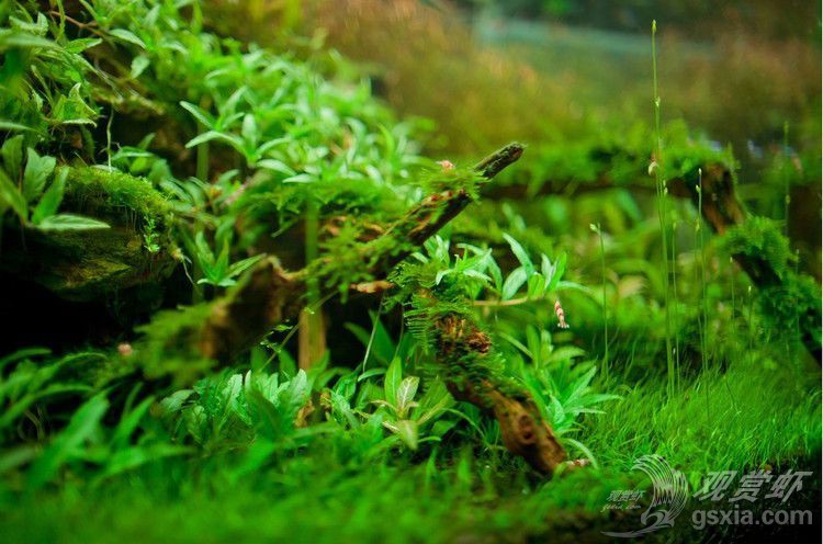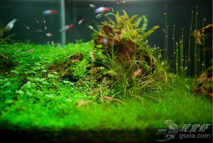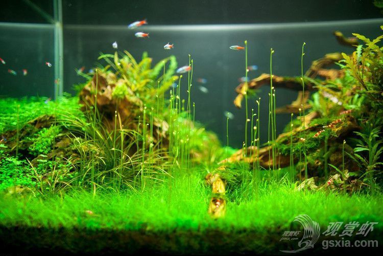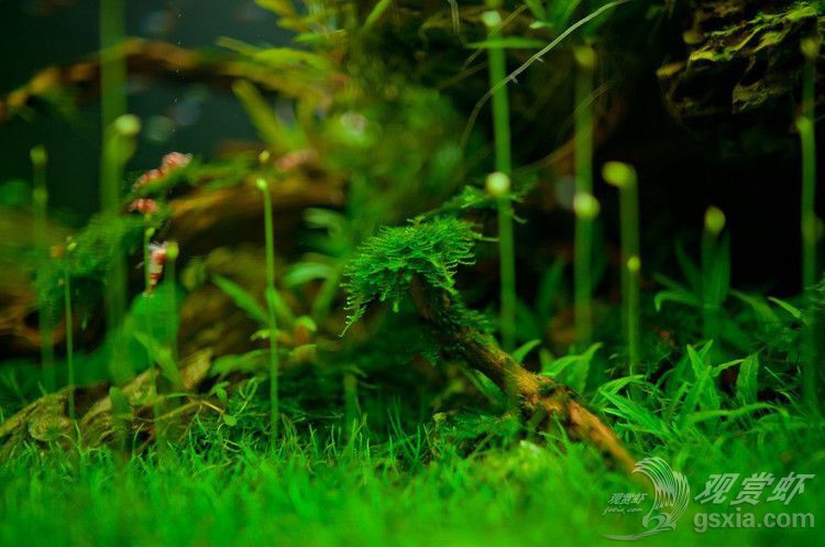可能不少朋友看过这个作品,这个造景的亮点不在于其风格或技巧,而是它的特色,作者在拍摄的时候用了大量的篇幅、角度去描绘它,它就是牛毛毡的水中花!很多人看到这么新颖的画面,一株株亭亭玉立的枝条拔地而起,顶着一朵一朵像似叶芽的小花,不禁疑问这是什么水草啊?按照清森同仁之前的造景经验,这是牛毛毡在一定环境条件下才会生长出来的“水中花”。至于是何种条件才可以让牛毛毡开花,并没有一个非常准确的说法,各位可以尝试加强光照并延长光照时间,前提是水质处于一个非常良好稳定的情况下,这是一种突破生长临界的培养方法,不代表一定会成功,在实施的时候注意长时间光照带来的青苔和藻类哦!