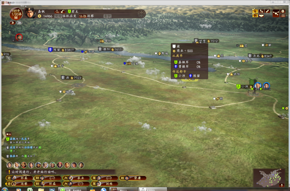 刘表是被我和董卓夹击挂了,刘焉是集合了十多万过来打我,硬扛下来了,顺便反攻了两城下来,陶谦也是集合二十多万,我正硬顶呢,刘备(俺新君主血缘关系点的刘备。。)去搞陶谦后方,围魏救赵解了我围,当然我顺势反击打得陶谦只剩一城,还把陶谦直接斩了(看不惯他欺负生父刘备啊。。)