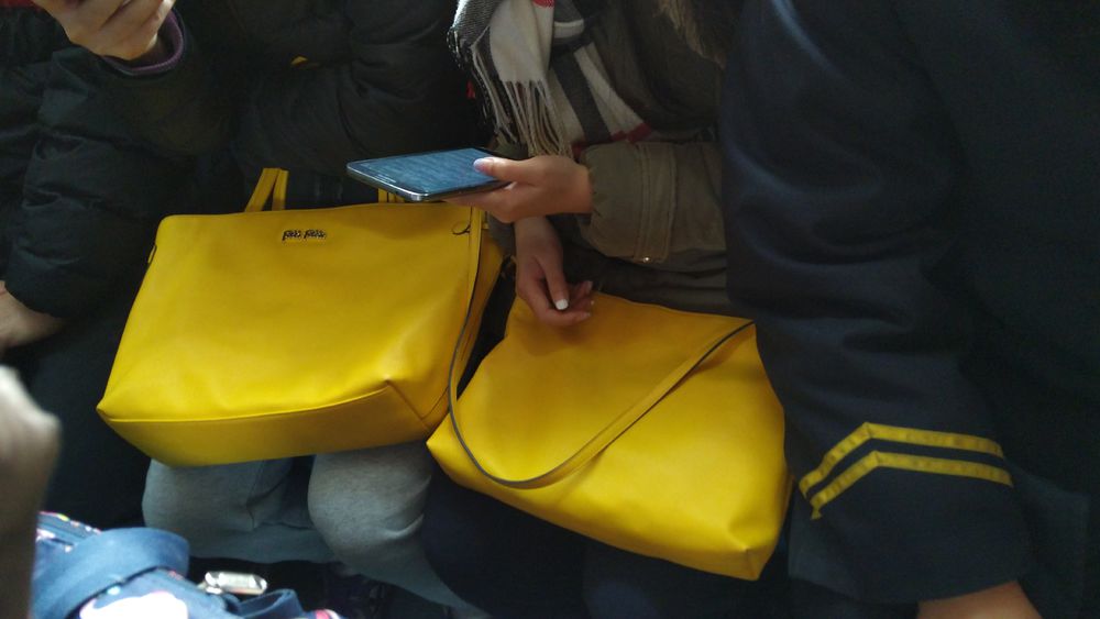 地铁座位上的情侣用这样明艳的情侣包。