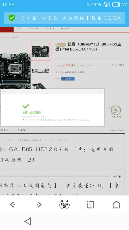 然后过了半小时,又看到一个技嘉b85 hd3,又拍了350,本来没抱希望拍下,结果…