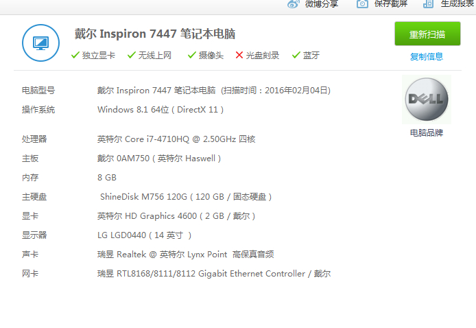 我这是最老版的戴尔游匣7447,CPU还是4710HQ的