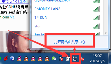 1、单击右下角任务栏上面的“网络图标”,然后选择打开“打开网络和共享中心”