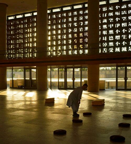 镂刻佛教经文的牆,是农禅寺的另一项创举。姚仁喜在道场长廊外,以混凝土灌镂空的字,写上一整牆的「金刚经」经文,大厅西面的木牆则刻上「心经」经文。当阳光洒落穿透经文,佛教经典化为光影洒落信众身上与心间。