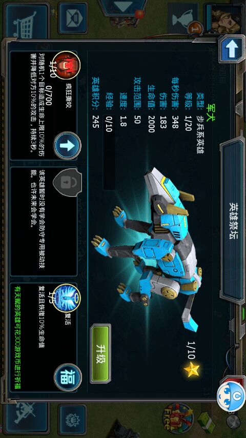 第三种充能狗,知道它有用的人就少很多了,但实际上这种狗并不输于疾行狗,请看高手科普:普通狗每秒攻击1.9次,攻击8次蓄满能量,即充能一次需4.2秒,所以5级充能可以节约4.2秒,4级充能80%可以节约3.4秒,3级充能可以节约2.5秒,2级充能可以节约1.7秒,1级充能可以节约0.8秒,效果比同级的疾行差些,但充能狗有个优势就是碰到3路都防时可以用复活炮灰掩护充能狗,这样双方英雄等级差距不是太过巨大时还是有较大几率可以过关.