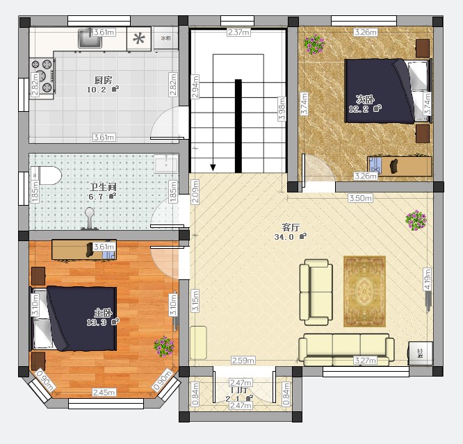 我同学家就是这样的,不过主卧是厨房,依次是次卧卫生间,主卧。没有那块白色空地,是有点悬浮式的,很漂亮。
