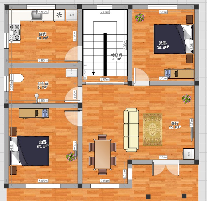 主要是南面阳光好,我想放置卧室和客厅,厨房就只能最里面了。卫生间已经最西边了(考虑上下水方便)。大门和房门都没有正对的。
