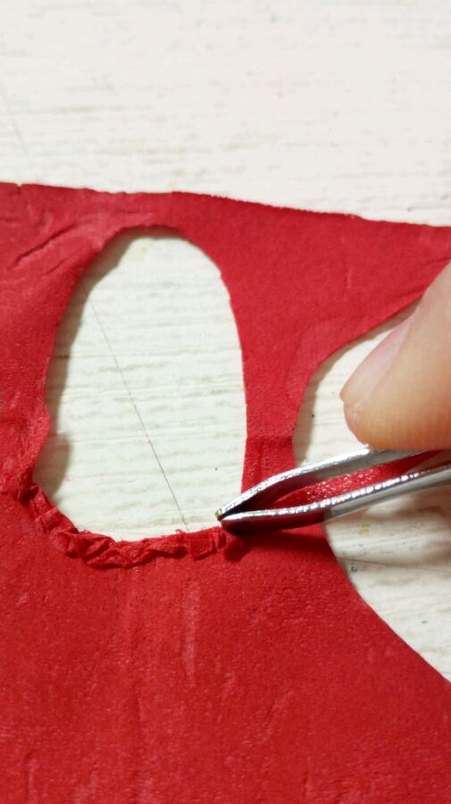 用镊子夹住纸条粘在领口处,记得弄出褶皱