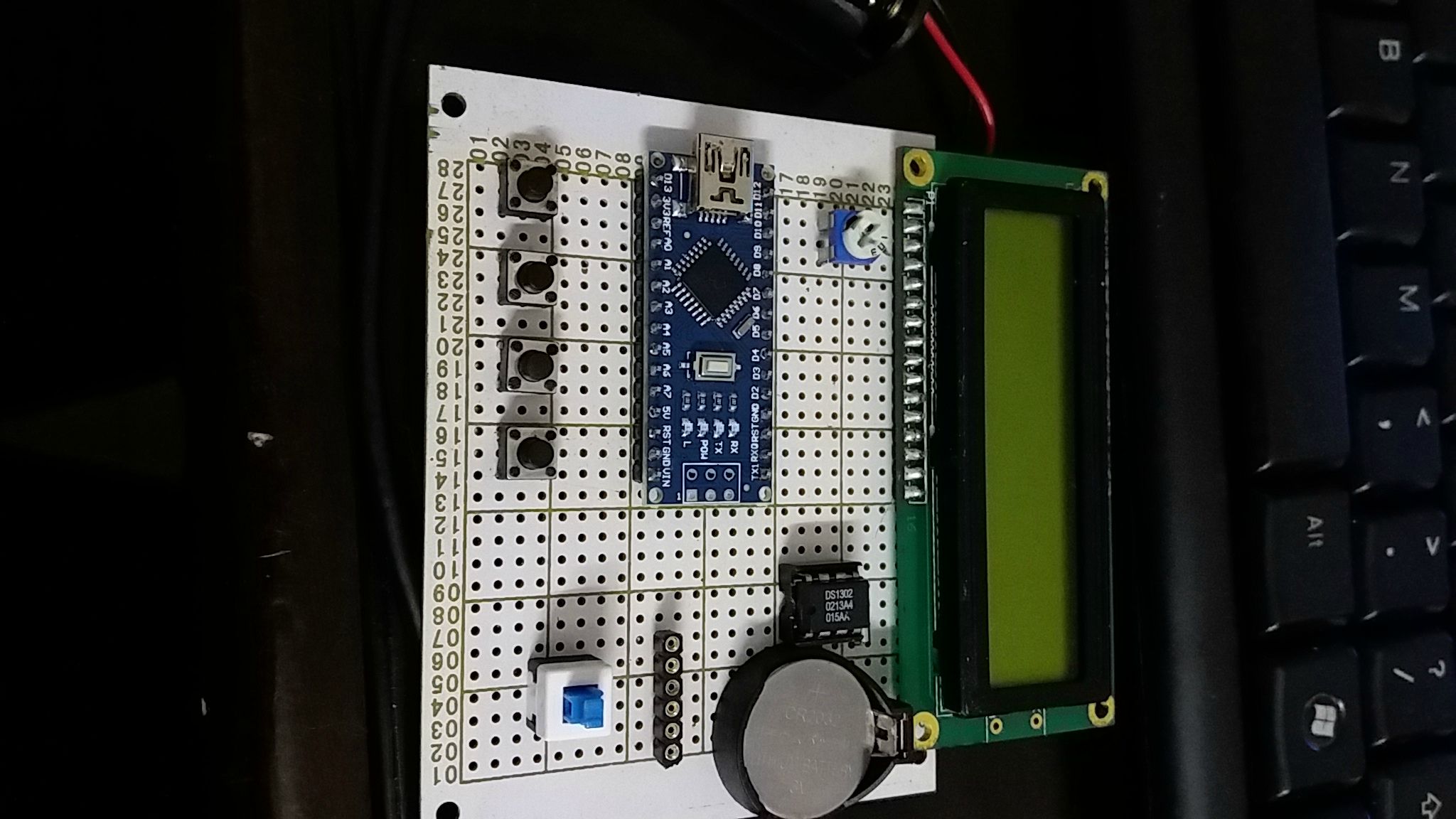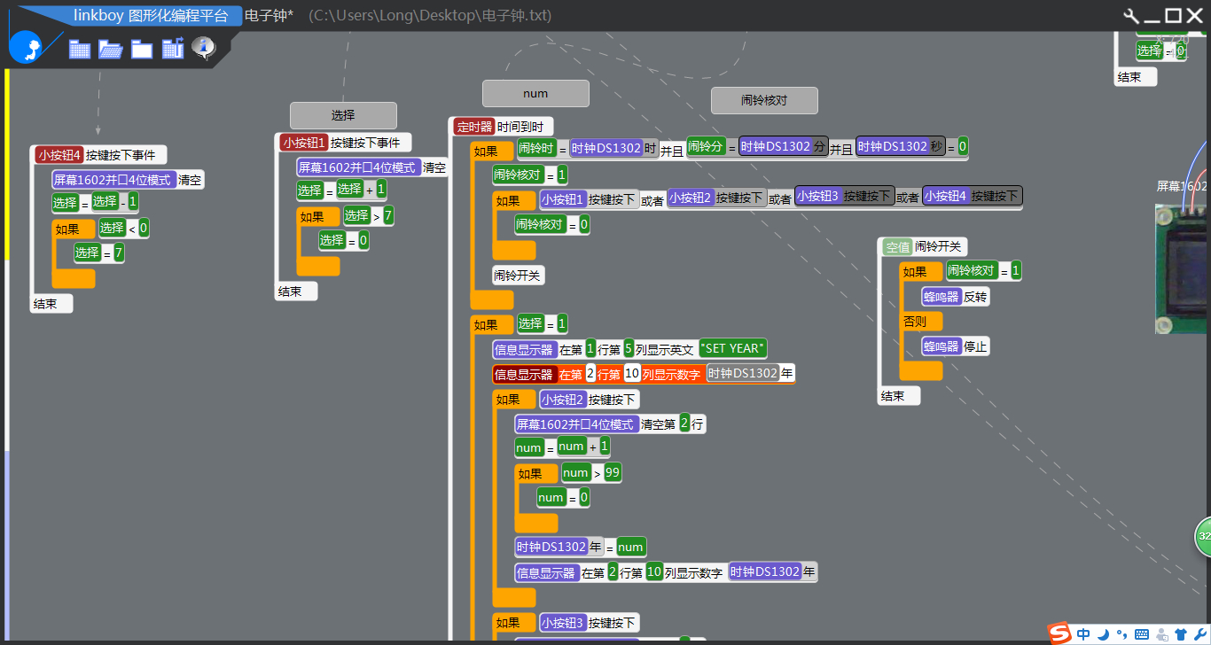 线是非常乱,没有事先画图,想到什么就做什么。第一张图就是事先设想的布局,后来焊完了就忘记蜂鸣器了......做闹钟还有点不明了的地方,反正以后想做闹钟再插上去吧。