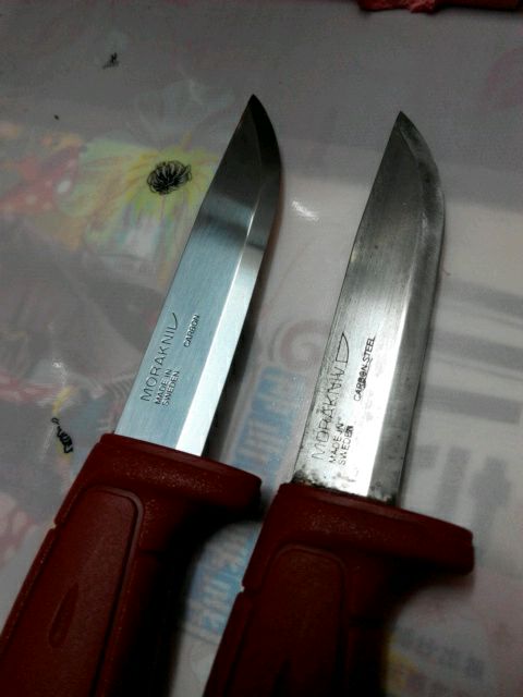 跟第一把比,做工好了很多,刃面光滑,有传说中的雾状镜面效果(以前有开刃痕迹一道道竖线就像这样[黑线]),刀背还是很沧桑,刀条连接处还是有缝隙,然而,那又怎样,我喜欢,谁用谁知道