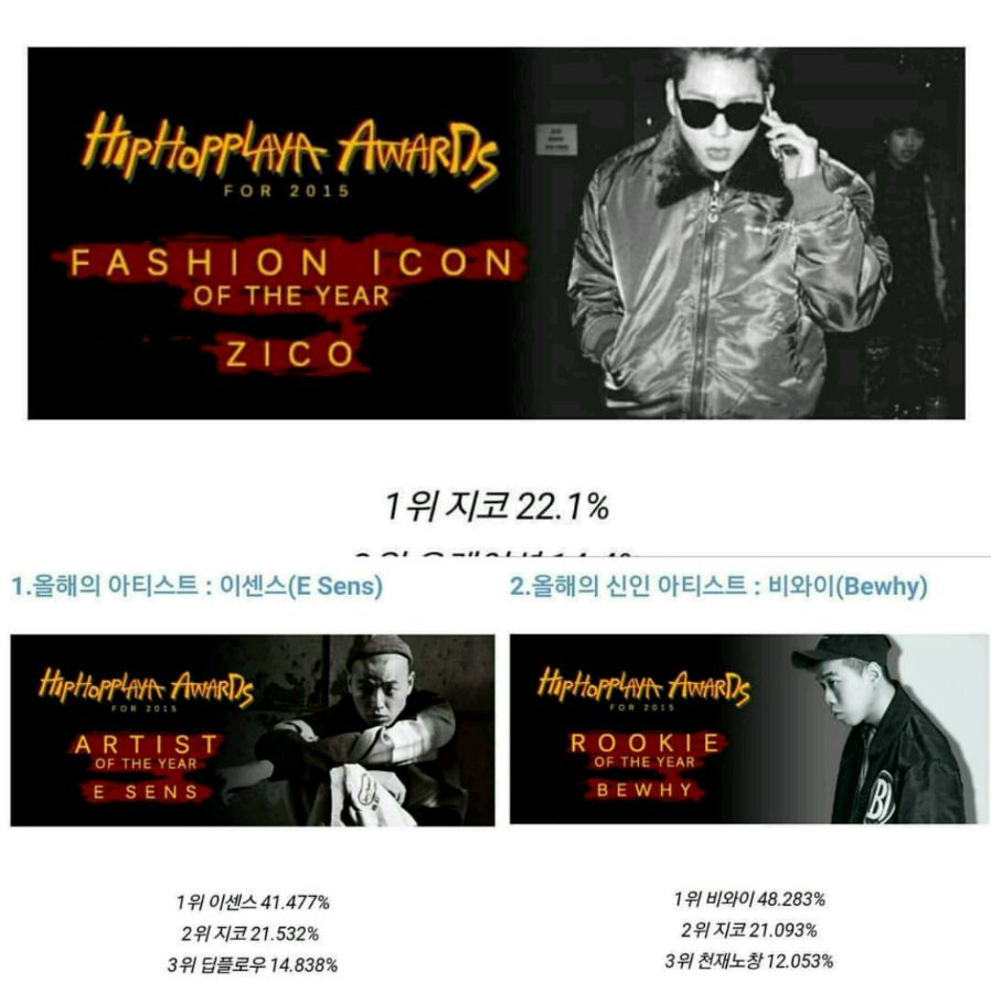 回复 狂奔的兔小宝ty : 这是之前关于2015Hip Hop年度大奖的投票结果。Zico荣登时尚icon一位!年度艺人二位!年度新人二位!