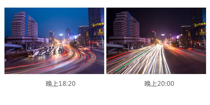 前后10—20分钟左右,这个时间段内天空可能是落日余晖,可能是一片蓝色青色,结合城市的暖色灯光,这种冷暖的色彩对比可以让 画面的色彩显得更加丰富。而如果晚上八九点钟进行拍摄,那么天空会是一片漆黑。