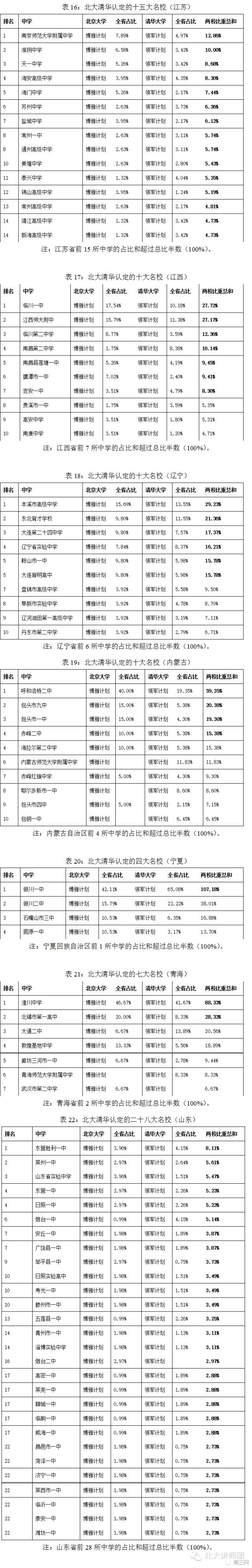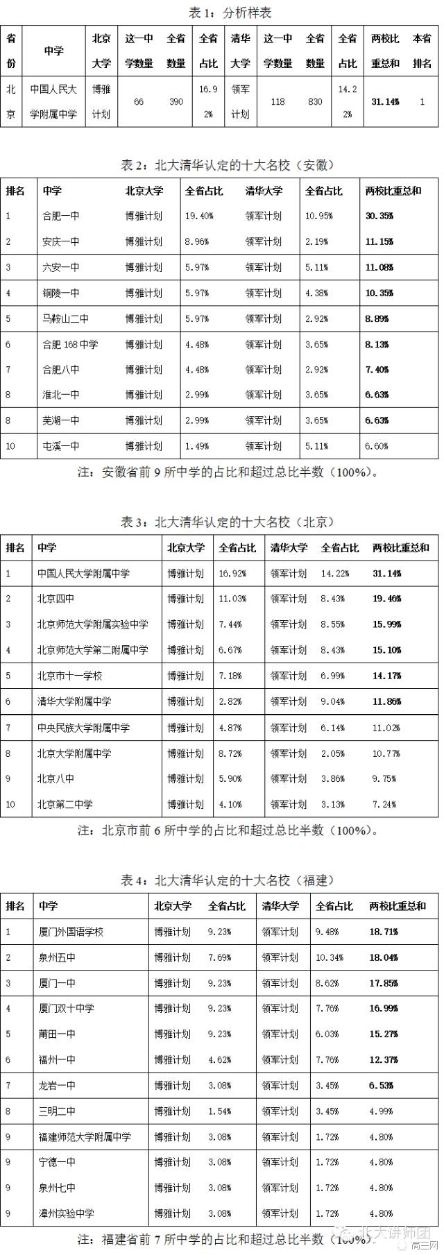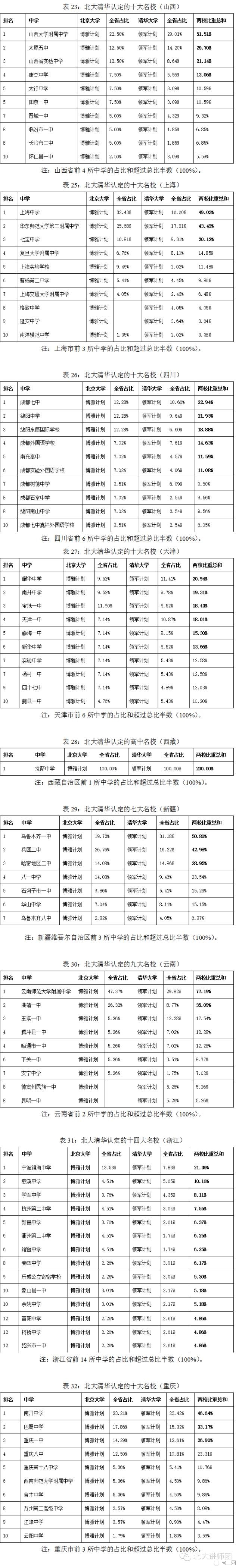 近日《北大清华认定32省顶尖高中排名》表单出炉!只是依据的是北京大学博雅计划、清华大学领军计划2015年的资格初审数据,梳理出两校认定的各省名校,可能会是国内最接近事实的中学排名。