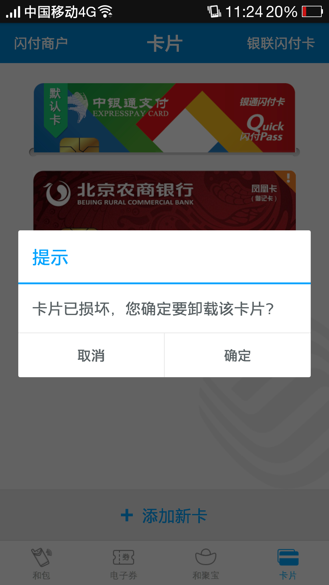 在和包里下了两张卡分别是北京农商银行的和深圳农商银行的,下载了一半是卡异常,也不能卸载,怎么办?