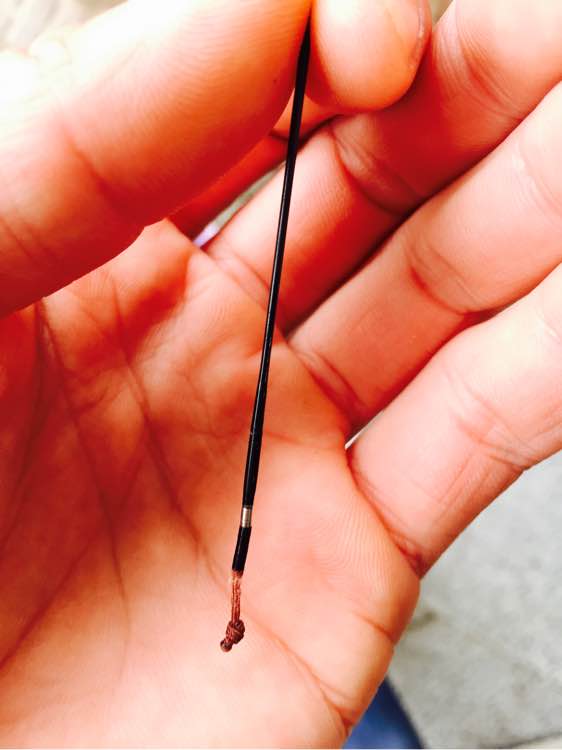 本来,这个事也就过去了。恰好昨天见一吧友问转圜脱落处理方法,多嘴参考了一句。今天得闲带着荒玩了会,收竿时候顺眼瞅了下小辫,漆皮上怎么一圈细线?一揪揪下来了。
