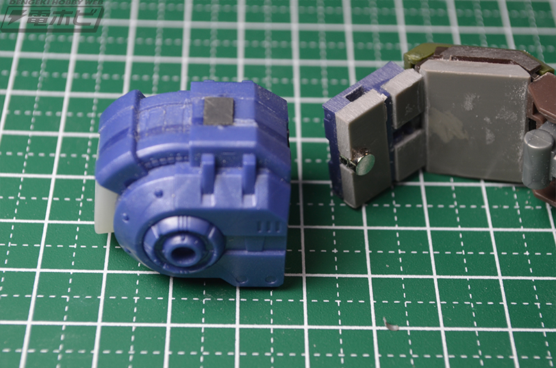 肩のショルダーグレネードの固定はネオジム磁石。肩側には磁石を埋めず、切れなくなったデザインナイフの刃を加工して貼り込んでいます。軽い部品なら両側を磁石にせず磁石に吸い付く金属の板を貼っておくだけで脱着できるので、省スペースで応用が効きます。