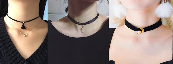 虽然说黑色的基本款很好看,但其实还有更多的款式。像上图就有绒布、缎带、细绳、流苏等等,你可以依照今天穿搭的风格来选择颈链,不一定要一条戴到底喔!