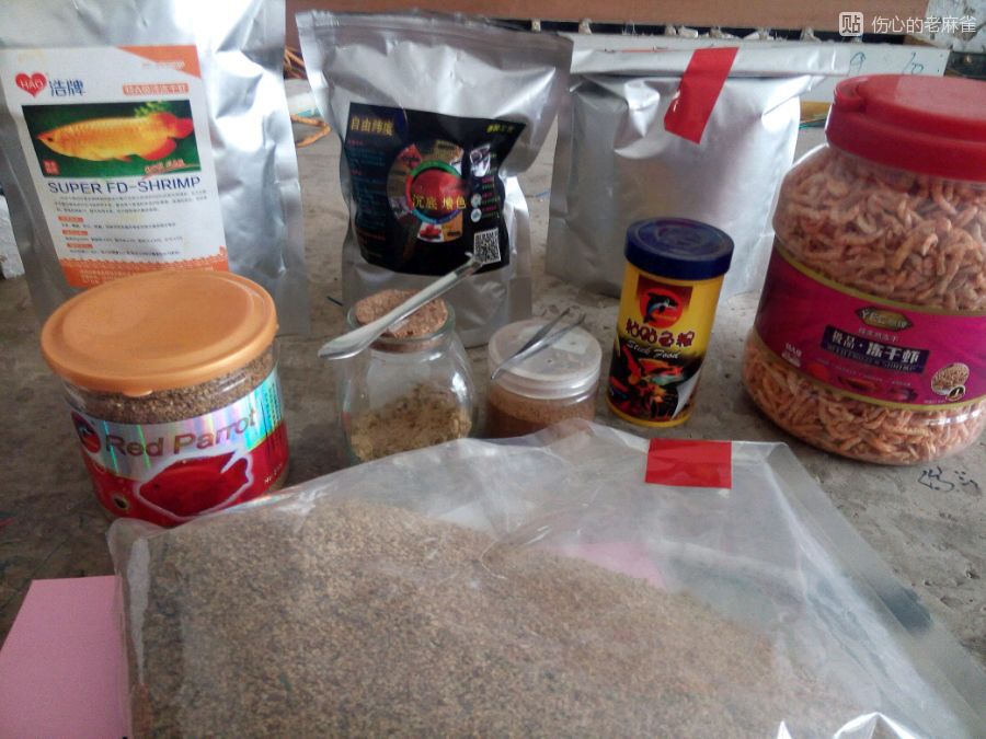 另外一个小缸养的玛丽,米奇,孔雀,彩裙,我发现每种鱼粮它们都拼命吃,索性来个什锦的,^_^里面有薄片鱼粮,底牺鱼粮,下沉微粒,水蚤干,弄碎的南极麟虾,丰年虾卵,贴片鱼粮,弄碎的鹦鹉鱼粮,营养上色肯定均衡,哈哈!