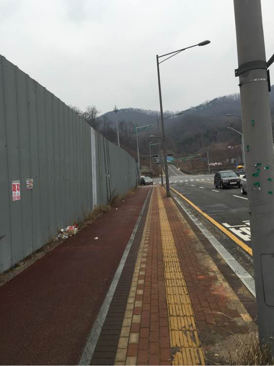 出站后我们左转,看到左边是在建的乐天的一个商场,走到路口左转,看到对面是小山坡在左转,等于是在地铁站的背面,我们总算找到了车站
