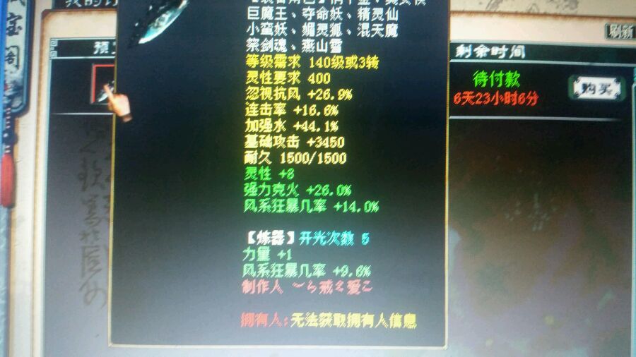 还有这个武器,他说3亿卖我,知道我买了这个,把我一顿说,说价格差不多,他的这把比我的好多了去了。。。除了狂暴多点,也没啥吧。。。。差200块钱。。。
