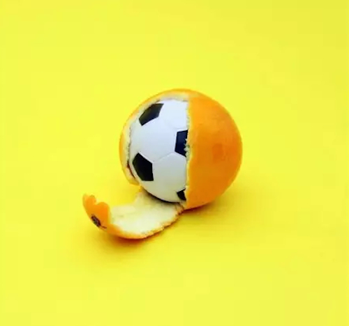 圆滚滚的柳橙剥开里面竟是一颗足球,何尝不是在新视角下的新发现呢?细看之后便会觉得这样的组合也没什么不妥,只是将吃的东西转换为用的东西而已。