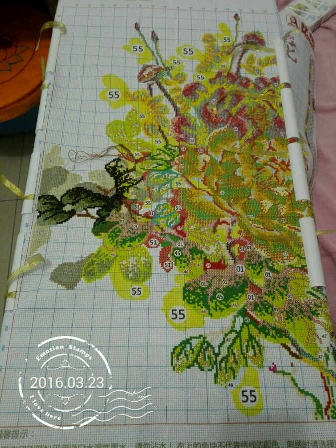 已经绣了一部分了,近照一张,上绣架一张。