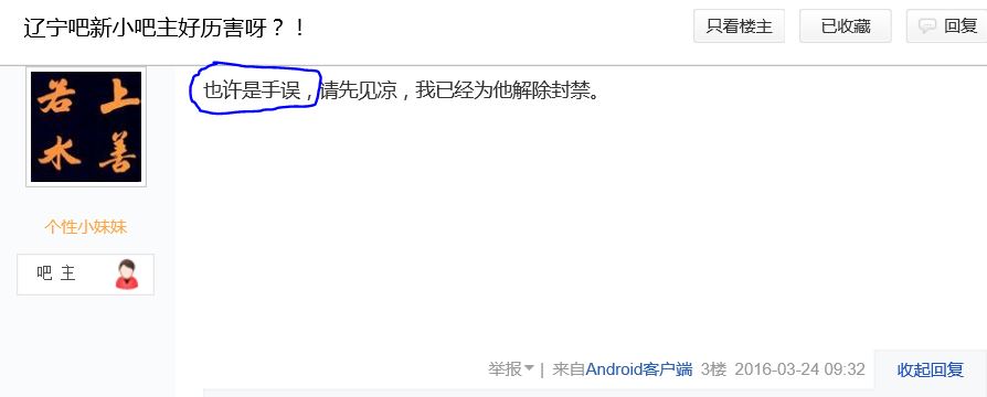 在狄仁杰的帖子里,封禁了狄仁杰,他是吧务。今天,一个小吧友又封禁了另一个小吧主。难道你们真想为了某种我不知道的原因,让辽宁吧大乱下去?
